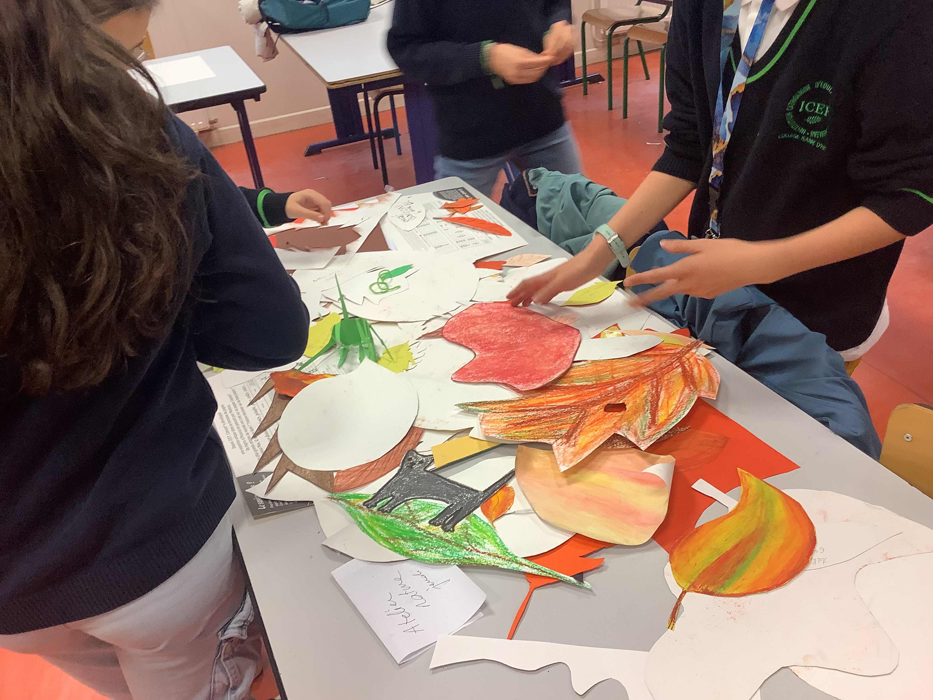 Dans le cadre des ateliers libres du midi, les élèves de « L'atelier nature » (atelier de pratique plastique encadré) se sont essayés à la réalisation d'une œuvre collective sur le thème de l'automne.