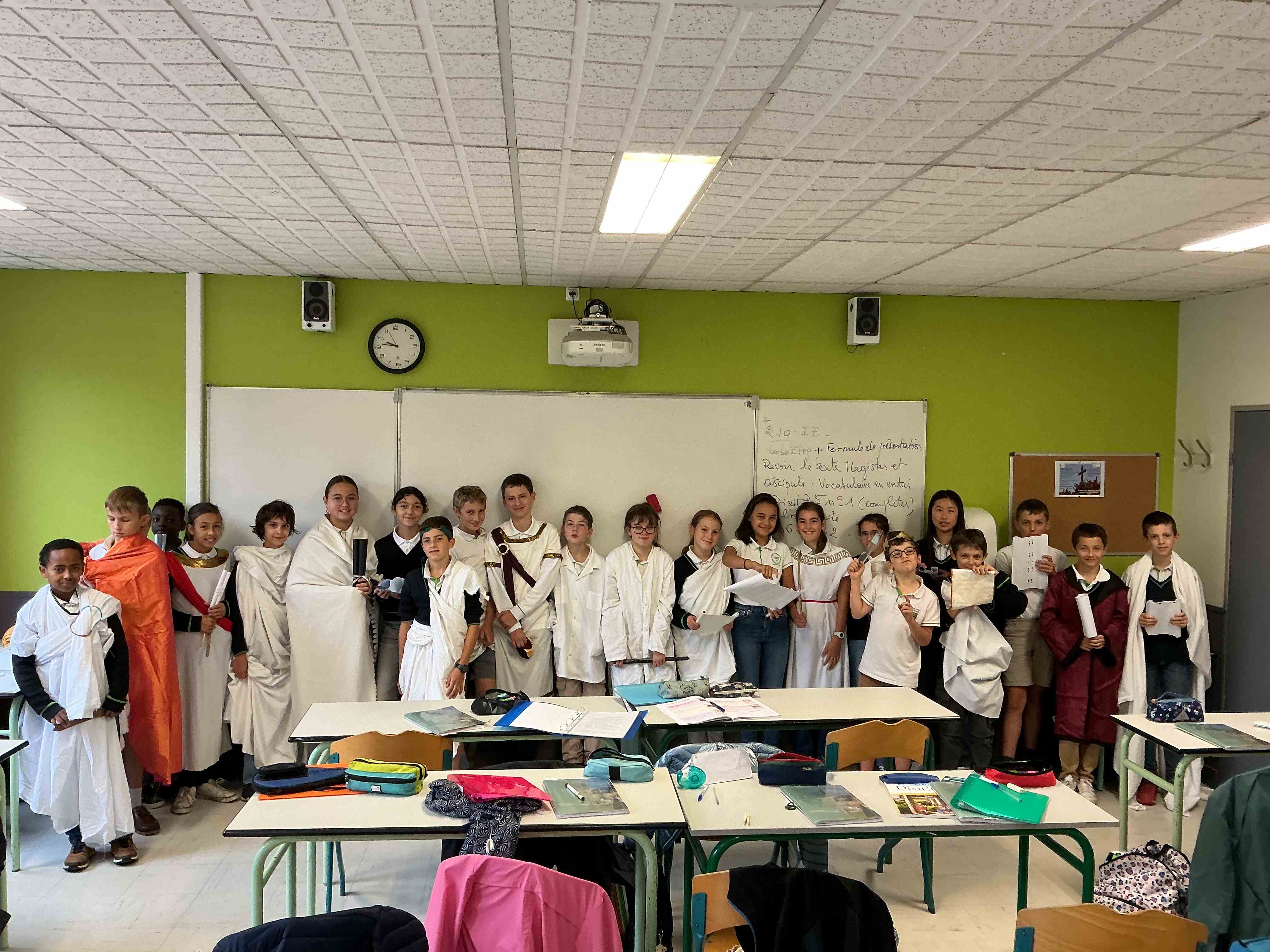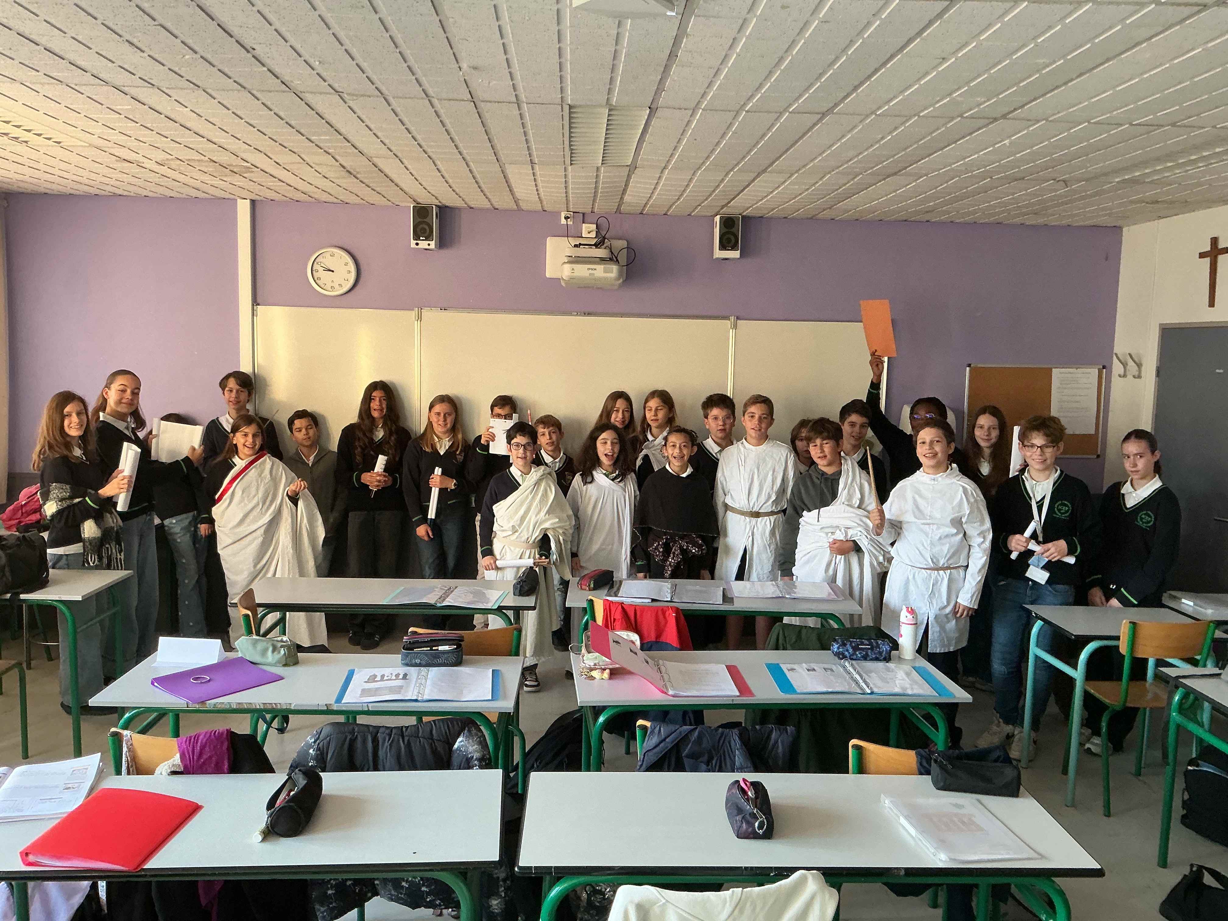 Quand les latinistes foulent les planches. Publiée le 03 Octobre 2025 par a_reggiori Les élèves de latin de 5ème6 et 5ème7 se sont mis en tenue pour jouer des saynètes sous la direction de leur professeur, madame Beyeler.A vos toges, férules, volumen et tabula, histoires de maître et d'élèves.