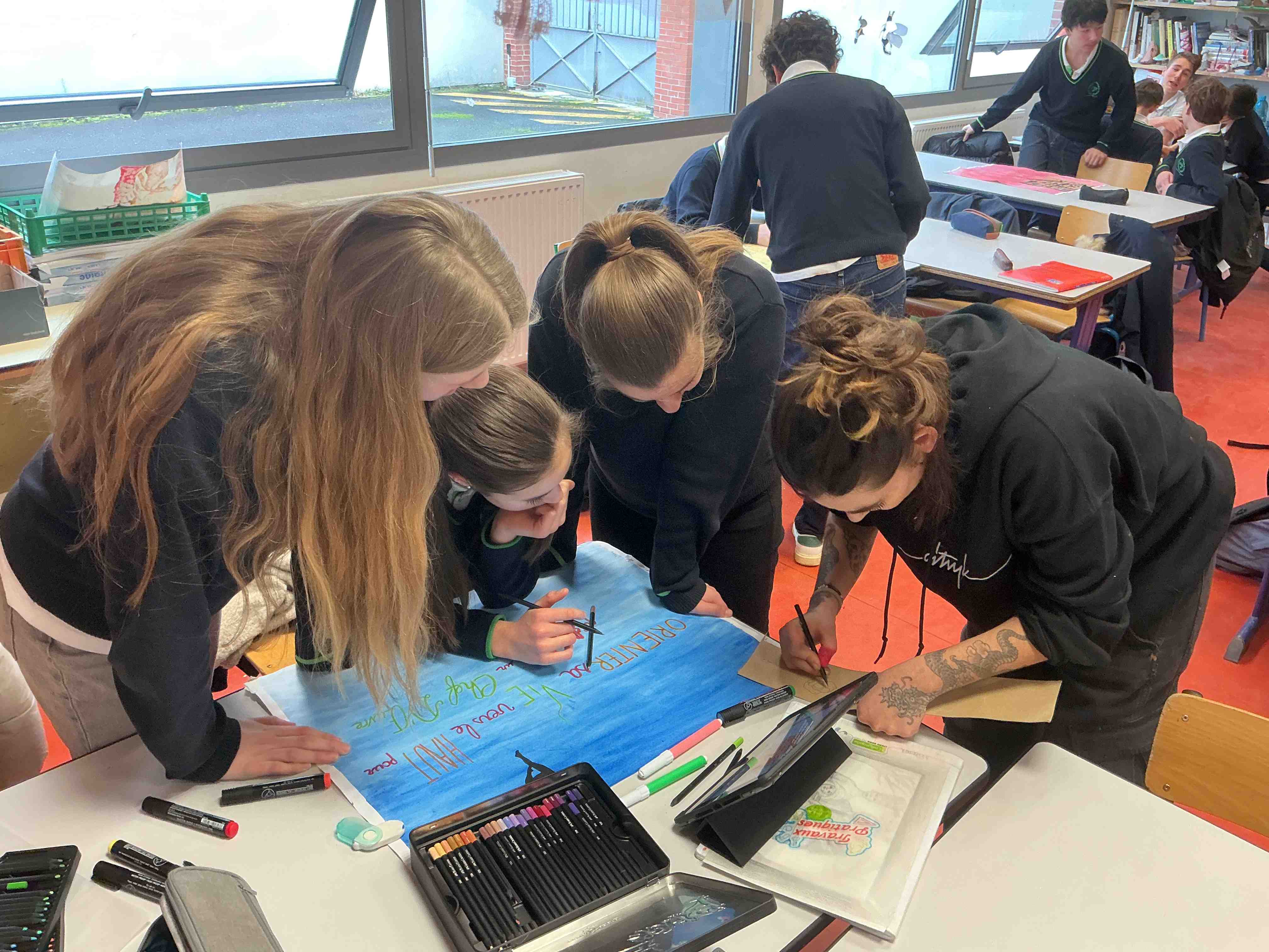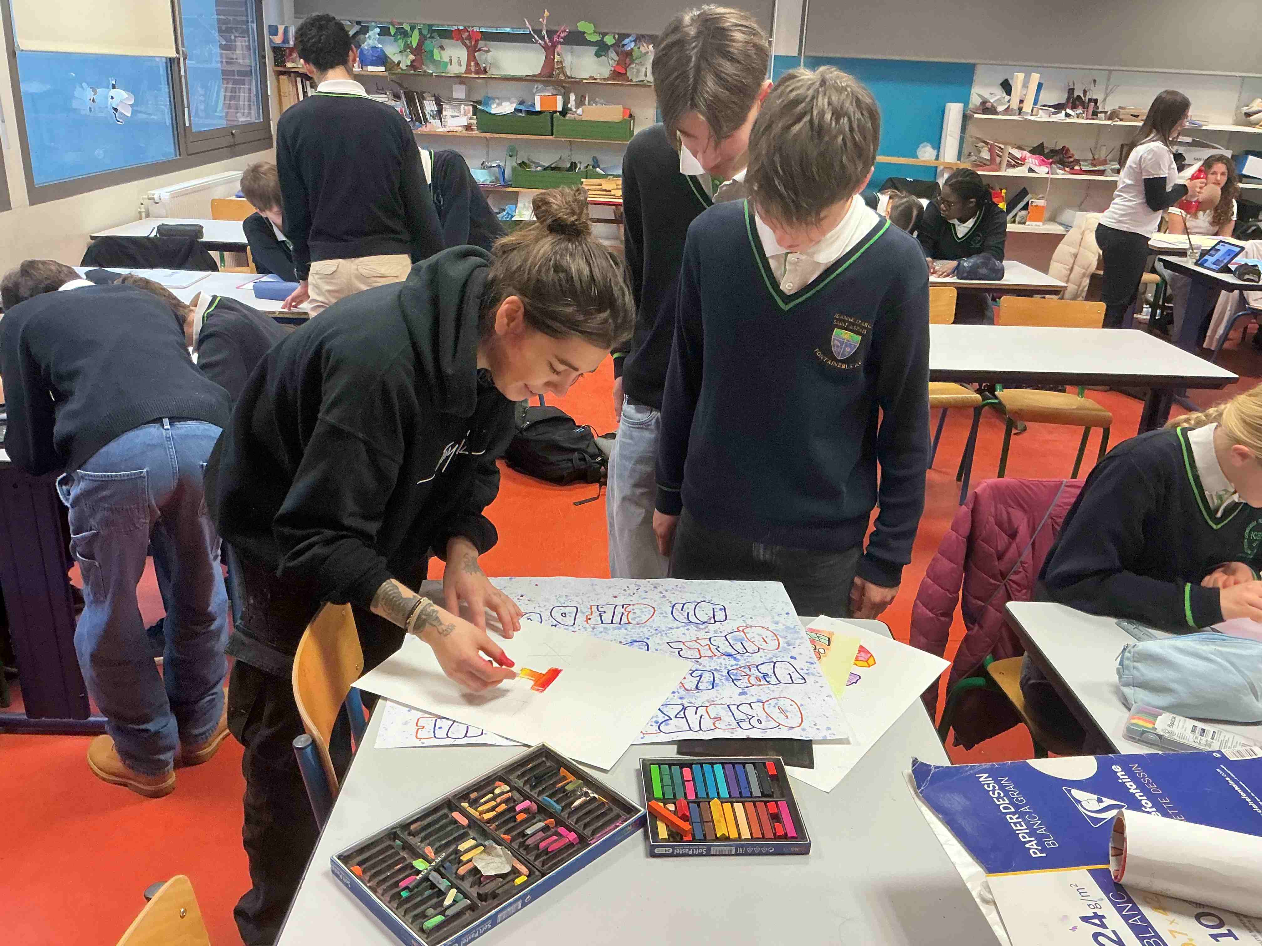 Tous les élèves de 3ème ont rencontré la street artiste Cros qui a échangé sur son travail et sur les maquettes préparatoires des élèves en vue d’une collaboration future de fresque.